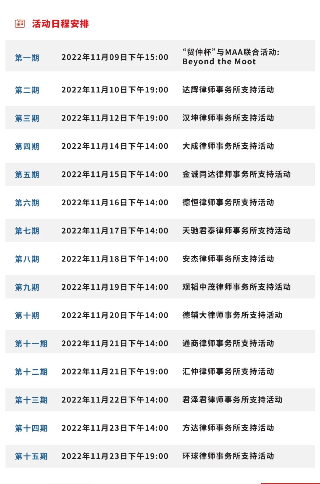 第二十屆“貿(mào)仲杯”國際商事仲裁模擬仲裁庭辯論賽Voice of Moot 系列培訓(xùn)活動將于2022年11月9日開始,至11月23日結(jié)束,共計15期相關(guān)活動?!百Q(mào)仲杯”辯論賽自2000年舉辦至今已歷經(jīng)十九屆,辯論賽始終秉持培養(yǎng)具備國際化實(shí)務(wù)能力的涉外仲裁法治人才的初心,匯集了大批國際仲裁法律人才。