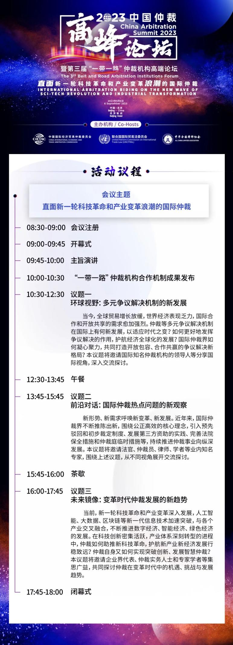 本屆論壇以“直面新一輪科技革命和產(chǎn)業(yè)變革浪潮的國(guó)際仲裁”為主題,攜手全球仲裁法律專家聚焦新時(shí)代背景下的前沿?zé)狳c(diǎn),就國(guó)際仲裁的實(shí)踐經(jīng)驗(yàn)和最新成果展開交流對(duì)話,展望國(guó)際爭(zhēng)端解決的未來(lái)發(fā)展方向。同時(shí),值“一帶一路”倡議提出十周年之際,為進(jìn)一步凝聚法治共識(shí)、增進(jìn)法治互信、深化法治交流,將同期舉辦第三屆“一帶一路”仲裁機(jī)構(gòu)高端論壇,推動(dòng)共建“一帶一路”高質(zhì)量發(fā)展。
