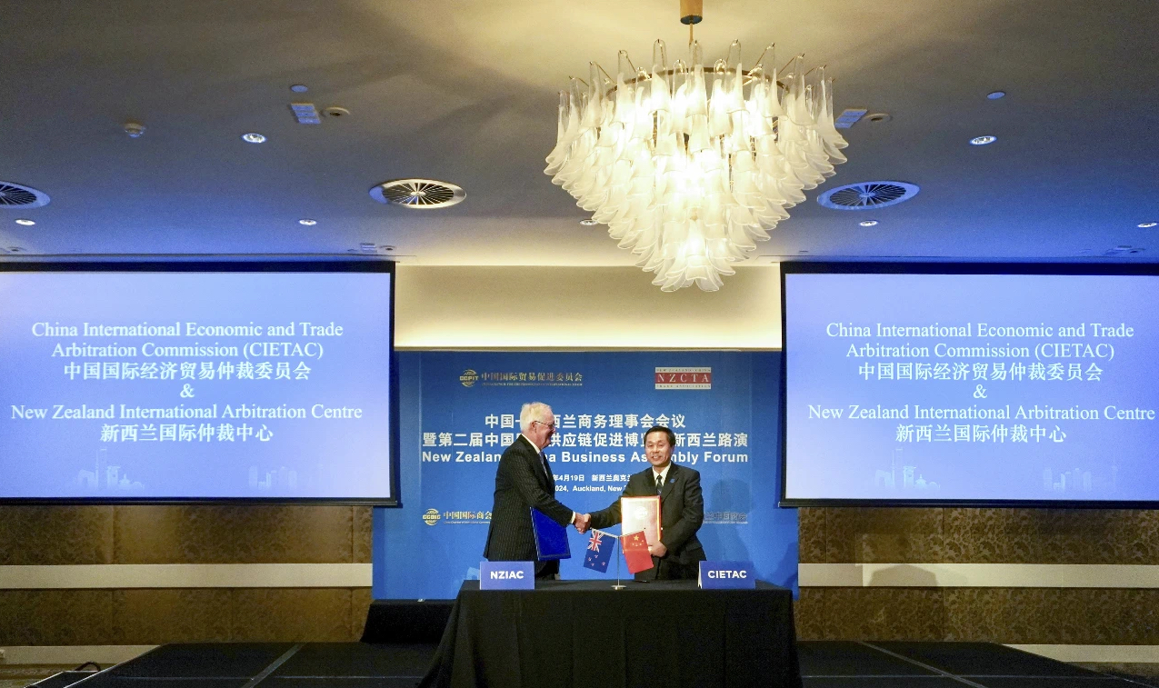 4月19日,在中國貿(mào)促會會長任鴻斌率中國企業(yè)家代表團訪問新西蘭期間,中國國際經(jīng)濟貿(mào)易仲裁委員會副主任兼秘書長王承杰與新西蘭國際仲裁中心主任約翰·格林在奧克蘭于第五屆中國—新西蘭商務(wù)理事會會議上簽署合作協(xié)議。中國貿(mào)促會會長任鴻斌、新西蘭中國貿(mào)易協(xié)會主席約翰·考克倫、中國駐新西蘭大使王小龍等出席簽約儀式。