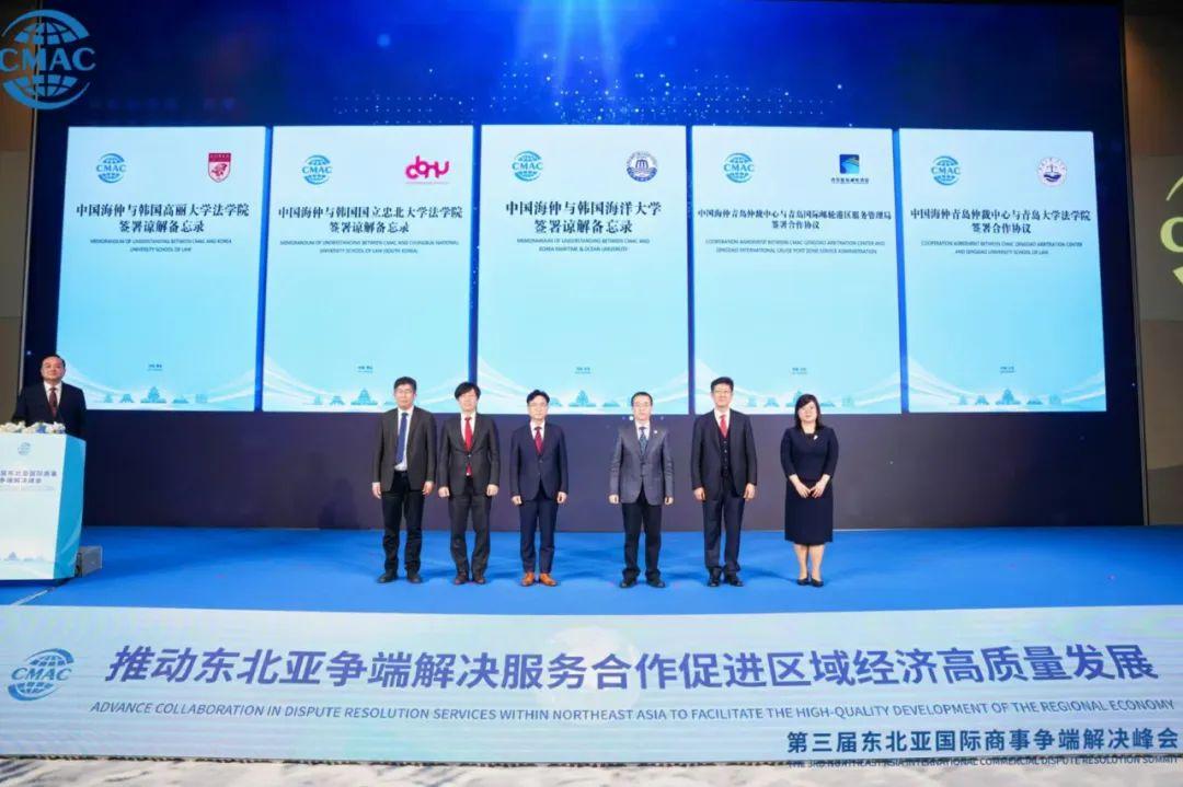 開(kāi)幕式后,在現(xiàn)場(chǎng)嘉賓見(jiàn)證下,中國(guó)海仲分別與韓國(guó)海事海洋大學(xué)、韓國(guó)高麗大學(xué)法學(xué)院、韓國(guó)國(guó)立忠北大學(xué)法學(xué)院簽署諒解備忘錄;中國(guó)海仲青島仲裁中心分別與青島國(guó)際郵輪港區(qū)服務(wù)管理局、青島大學(xué)法學(xué)院簽訂合作協(xié)議。成果發(fā)布環(huán)節(jié)由山東省貿(mào)促會(huì)會(huì)長(zhǎng)孟向東主持。