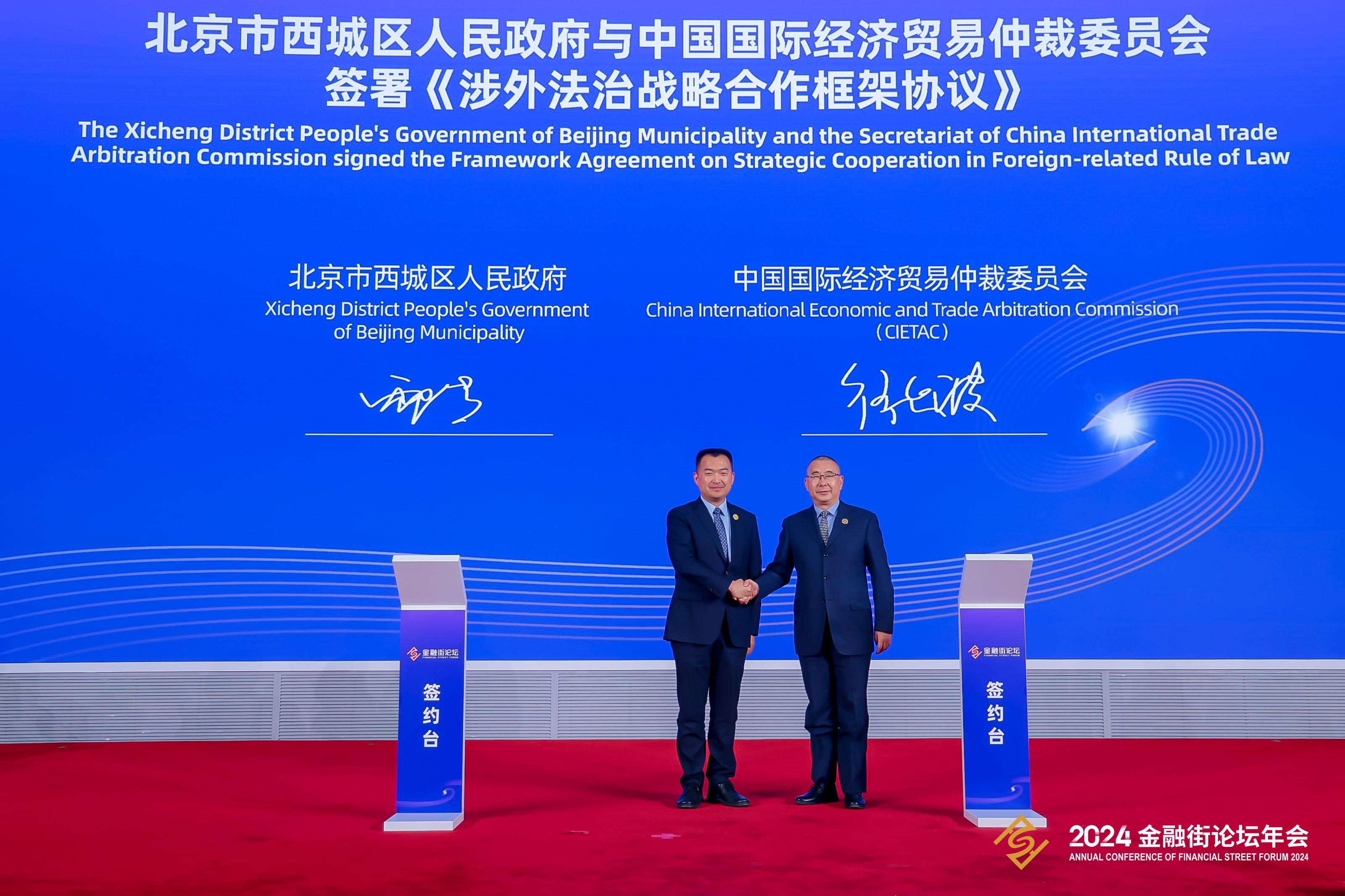 近日,在北京金融街服務局和中國經(jīng)濟信息社聯(lián)合承辦的2024金融街論壇年會金融街之聲——“金融街發(fā)布”成果專場發(fā)布活動上,中國國際經(jīng)濟貿(mào)易仲裁委員會(以下簡稱“貿(mào)仲”)與北京市西城區(qū)人民政府簽署《涉外法治戰(zhàn)略合作框架協(xié)議》。貿(mào)仲黨委書記、副秘書長徐延波與北京市西城區(qū)副區(qū)長邴浩共同在《涉外法治戰(zhàn)略合作框架協(xié)議》上簽字。