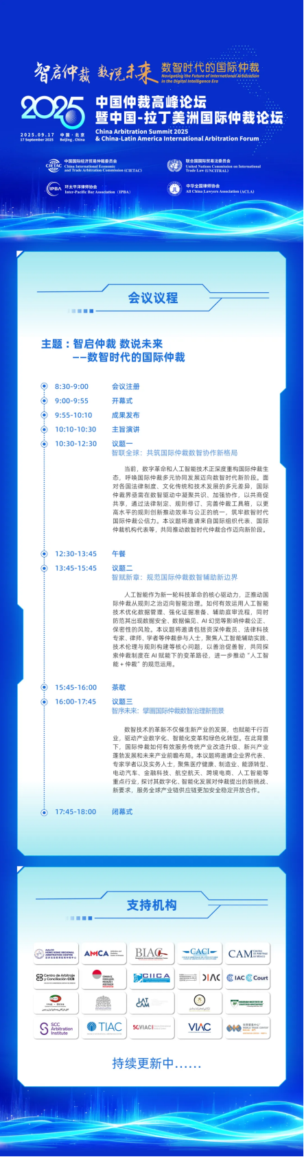 由中國國際經(jīng)濟(jì)貿(mào)易仲裁委員會(CIETAC)、聯(lián)合國國際貿(mào)易法委員會(UNCITRAL)、環(huán)太平洋律師協(xié)會(IPBA)以及中華全國律師協(xié)會(ACLA)聯(lián)合舉辦的2025中國仲裁高峰論壇暨中國-拉丁美洲國際仲裁論壇將于2025年9月17日在北京舉辦。