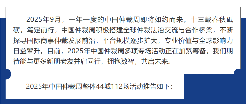2025中國(guó)仲裁周整體44城112場(chǎng)活動(dòng)推告