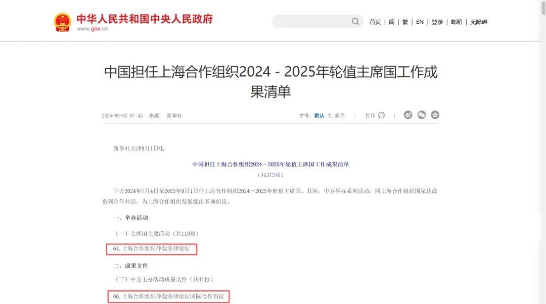9月1日,上海合作組織成員國元首理事會第二十五次會議在天津順利召開。外交部發(fā)布《中國擔(dān)任上海合作組織2024-2025年輪值主席國工作成果清單》(以下簡稱《成果清單》),中國國際經(jīng)濟(jì)貿(mào)易仲裁委員會(以下簡稱貿(mào)仲)兩項成果收錄其中。由貿(mào)仲主辦的“上合組織仲裁法律論壇”,被列入《成果清單》“主席國主要活動”(第64項)。論壇所發(fā)布的《上合組織仲裁法律論壇國際合作倡議》被列入《成果清單》“中方主辦活動成果文件”(第66項)。