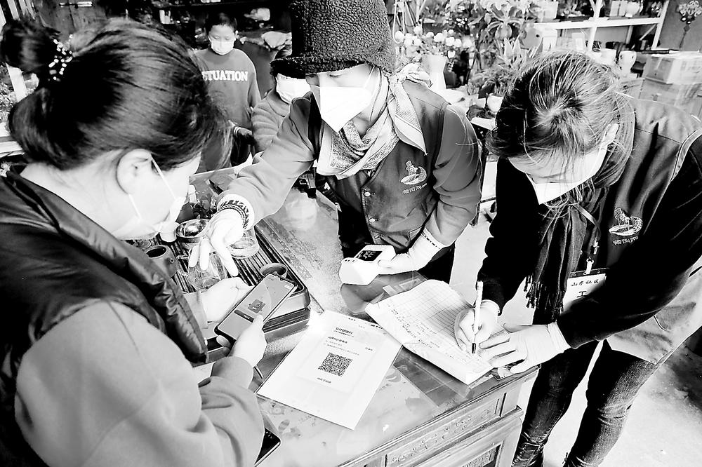 網(wǎng)格員對(duì)沿街店面進(jìn)行信息摸排登記。 陳琛 攝