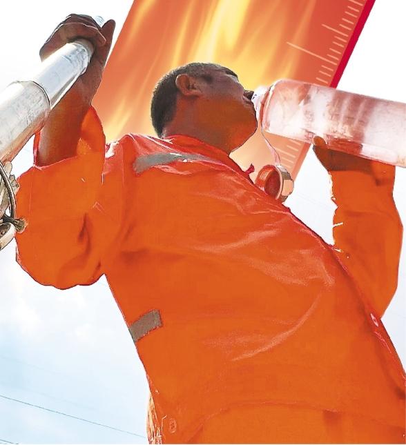 在合肥高新區(qū)天湖路與科學(xué)大道交口,環(huán)衛(wèi)工人在休息期間大口喝水。 記者 張正朋 攝