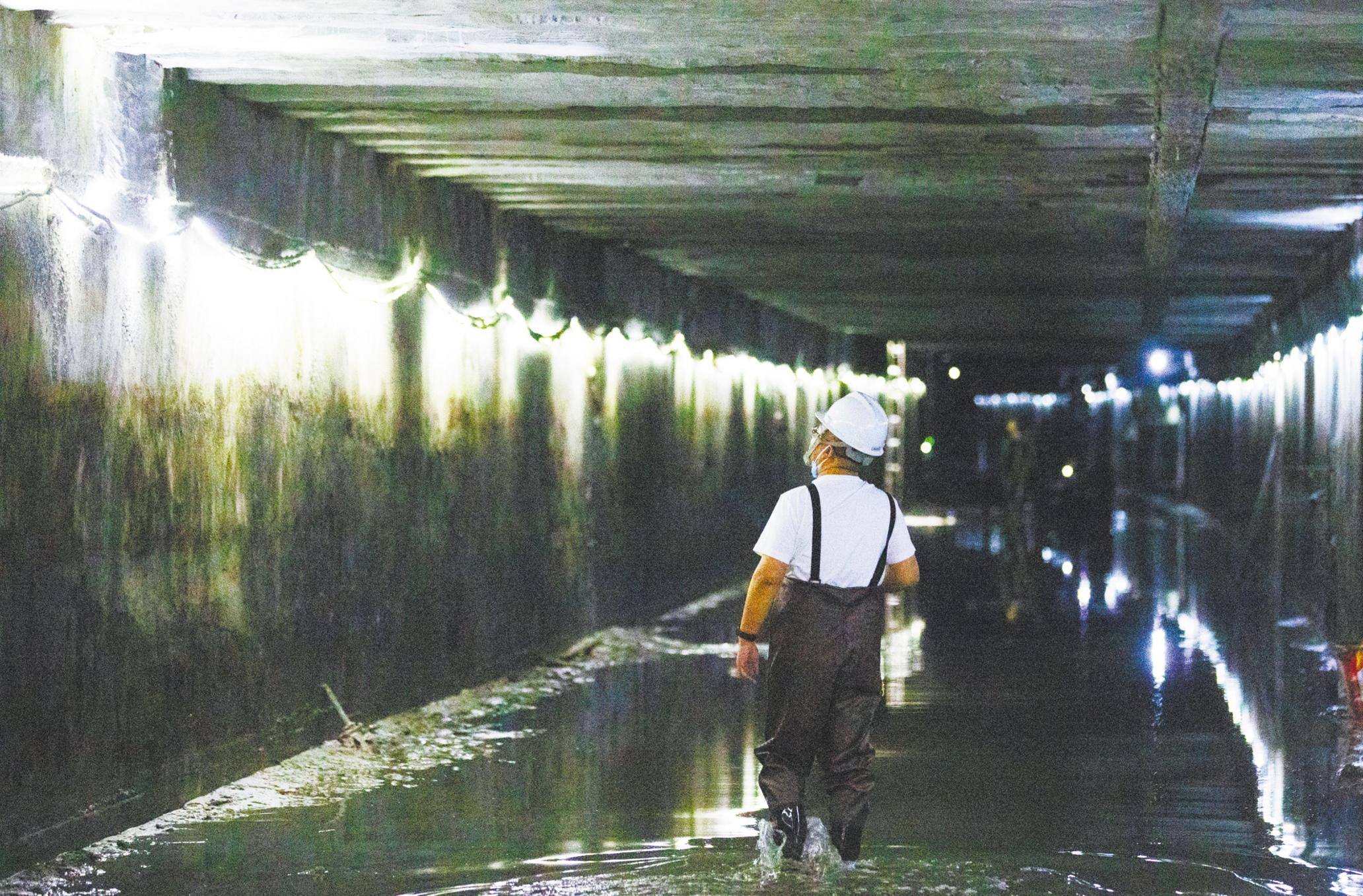 4月27日,技術(shù)人員在武漢黃孝河已經(jīng)完成清淤的暗涵內(nèi)巡查。