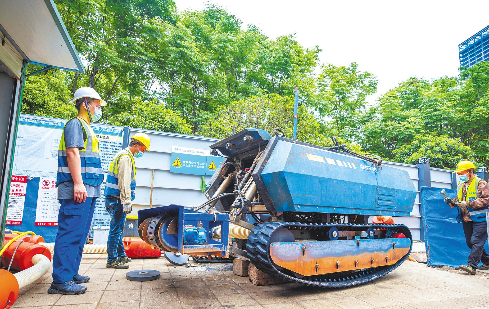 4月27日,武漢黃孝河暗涵清淤修復(fù)現(xiàn)場,技術(shù)人員將平時沉在暗涵底部清淤的機(jī)器人吊上地面,進(jìn)行維護(hù)保養(yǎng)。黃孝河機(jī)場河流域綜合治理一期工程是武漢在建規(guī)模最大、范圍最廣的管網(wǎng)修復(fù)工程。項目包含6.3公里機(jī)場河明渠清淤,35.2公里排水管道清淤修復(fù)以及29公里排水箱涵清淤修復(fù)。黃孝河機(jī)場河流域綜合治理一期工程將提升水環(huán)境質(zhì)量、加強(qiáng)行洪排澇能力,惠及大漢口片區(qū)250余萬市民。 (本欄圖片均由湖北日報全媒記者 柯皓 通訊員 翟巖 攝)