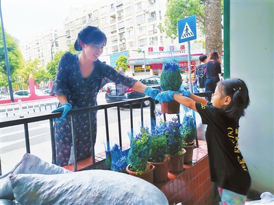 社區(qū)兒童參與打造園藝長廊。 本報記者 趙梓 攝