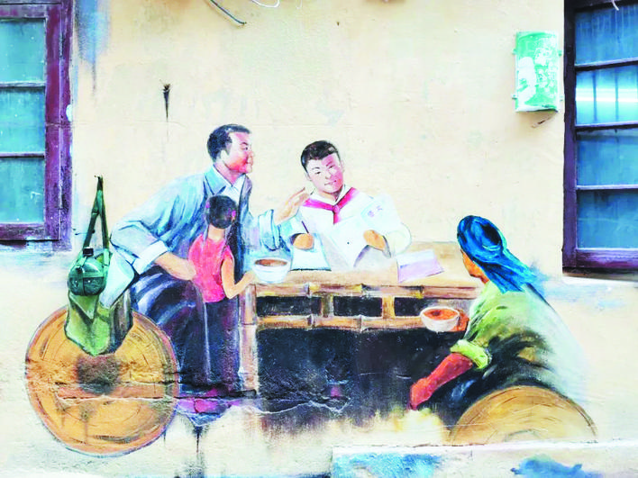 居民墻涂上上世紀80年代“民俗”主題墻繪,生火做飯的爺爺奶奶、買冰棍的小孩、看書的學(xué)生、帶著錄音機騎車飛奔的青年……這些栩栩如生的繪畫和屋檐下掛著的玉米、紅辣椒、大蒜、鳥籠等,給吳山巷增添了生氣和樂趣。路過的行人看到這些記錄著過往歲月經(jīng)歷的墻繪,不免回想起過去,感嘆現(xiàn)在生活的美好。