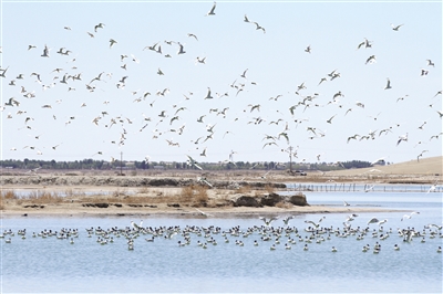 三五成群的遺鷗、赤麻鴨、黑翅長腳鷸時(shí)而用翅膀拍打水面展翅飛翔,時(shí)而在水中嬉戲、覓食,一幅鳥集鱗萃的景象。