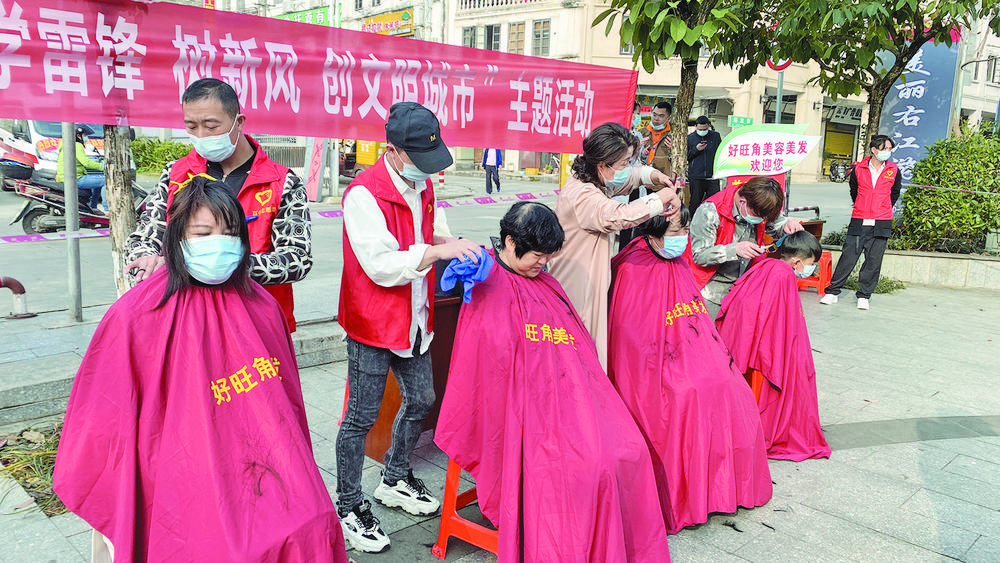 志愿者為市民免費(fèi)理發(fā)。