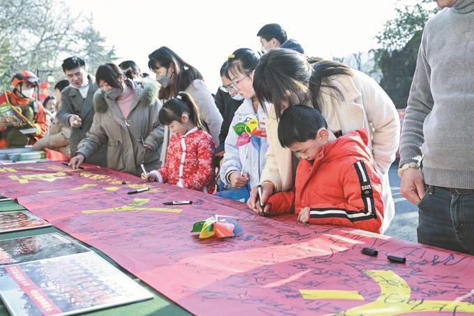 參加廟會(huì)的游客在“森林防火 人人有責(zé)”主題宣傳橫幅上簽字。 徐 浩 攝
