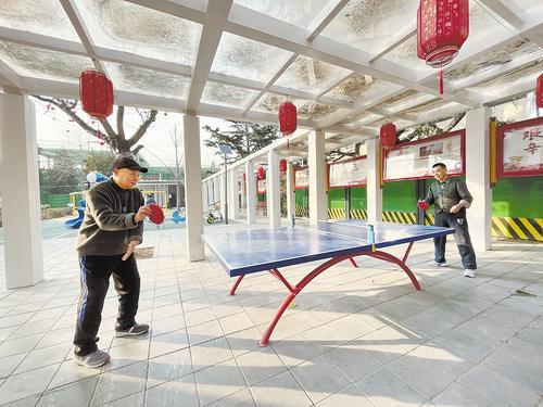2月22日一早,團(tuán)結(jié)里社區(qū)小廣場(chǎng)上,63歲的市民蔣艷麗和鄰居在球臺(tái)上打起乒乓球。