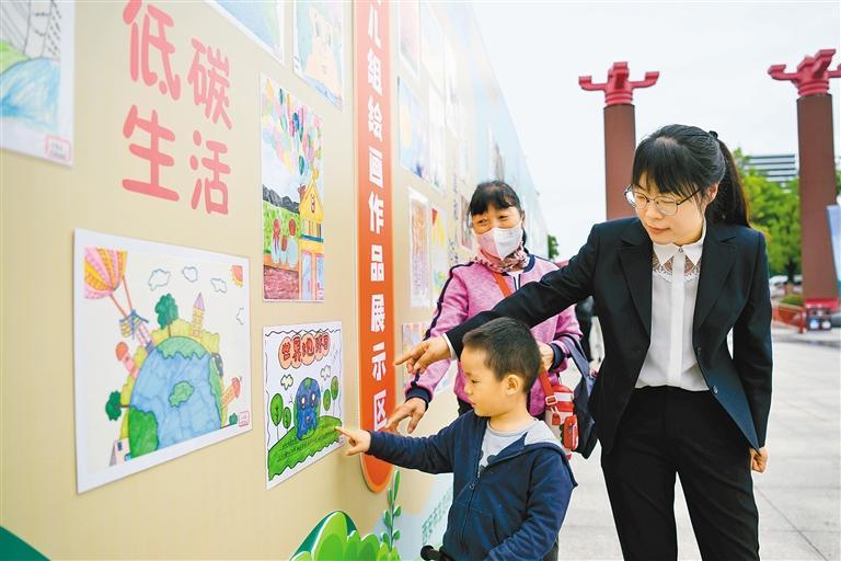 上午9時(shí)許,記者看到,設(shè)立在活動(dòng)現(xiàn)場的生態(tài)文明建設(shè)成效主題展板吸引市民紛紛駐足圍觀。另一側(cè)的巨大圖畫墻上,集中展示著由100名小朋友親手繪制的環(huán)保作品,用兒童的視角傳遞著環(huán)保理念。