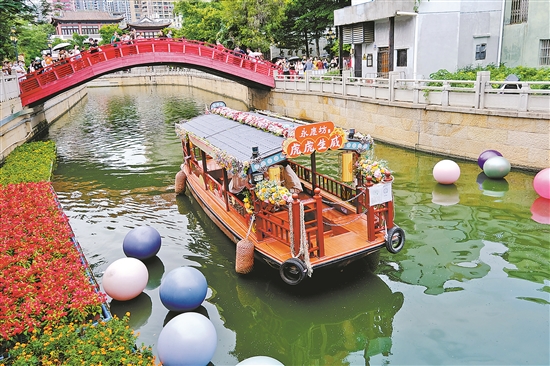一艘花船在永慶坊荔枝灣河道緩緩前行 記者 陳秋明 攝