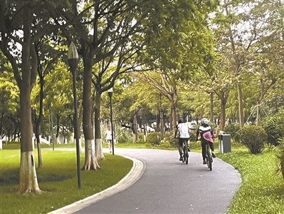 沿著香雪大道來到蘿崗濕地公園入口處,一株茂密的榕樹格外引人注目。記者沿著榕樹旁的綠道走進(jìn)濕地公園,道旁綠樹成蔭,蟲鳴鳥鳴聲聲入耳,綠道上還有三三兩兩遛彎或跑步的市民,稍遠(yuǎn)處則是湍湍流淌的南崗河。鄒先生和朋友剛跑完一個(gè)來回,大汗淋漓地在路旁拉伸:“搬來附近大半年了,基本每天這個(gè)時(shí)段來跑一圈,沿著綠道跑上兩公里,空氣清新,十分舒服?!?/p>