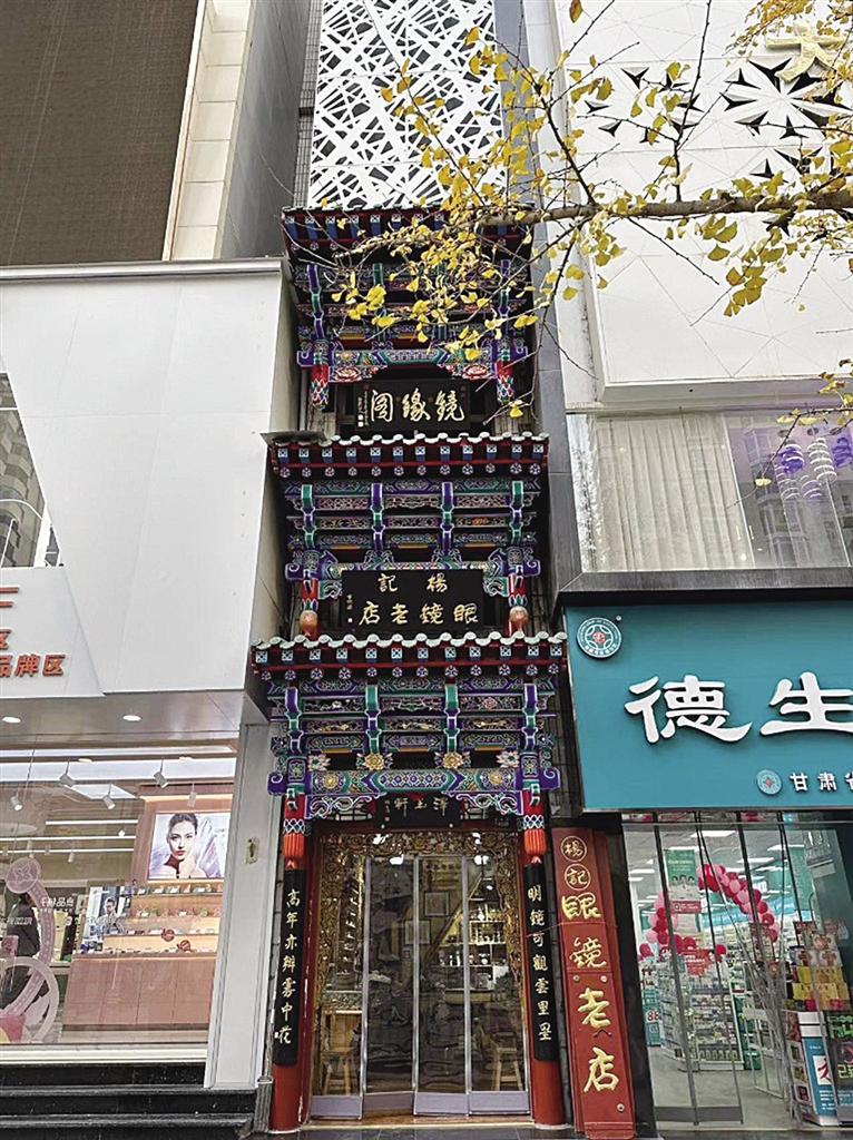 榫卯鑲嵌、手工木雕、精致彩繪、金箔貼邊,在張掖路步行街上,楊記眼鏡行的門樓招牌格外亮眼,雖然只有三四米寬的窄小門面,但店外從上而下的三塊古韻招牌彰顯出這家店的“不簡(jiǎn)單”?!白钕旅孢@塊‘澤玉軒’的招牌是我家祖輩楊澤玉開創(chuàng)這家眼鏡行時(shí)留下的字號(hào)”,楊記眼鏡行是蘭州一家老字號(hào)的石頭眼鏡售賣和維修小店,光是制作修理石頭眼鏡這項(xiàng)手藝就已經(jīng)傳到了第五代,其店鋪在二十世紀(jì)八九十年代就獲得過商務(wù)部的“中華老字號(hào)”認(rèn)可。