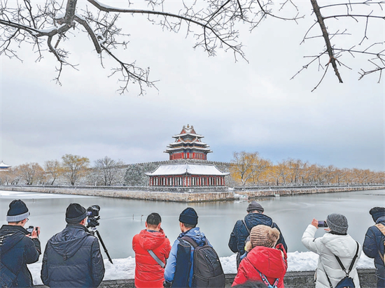 12月11日上午,在故宮西北,雪中角樓吸引不少市民游客賞景拍照。 記者 鄧偉攝