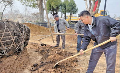 基地內(nèi)同樣熱鬧,挖掘機(jī)吊起楓樹(shù)樹(shù)苗,穩(wěn)穩(wěn)地放入提前挖好的樹(shù)坑中。程偉達(dá)帶領(lǐng)苗木工人,扶苗、培土、踩實(shí)、澆水……
