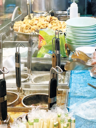 在一家名為“討喜燒牛雜檔”的餐館內(nèi),后廚店員正將一顆顆魚蛋從一個綠色商品包裝袋中取出,投入鍋內(nèi)加熱。很快,一碗牛丸魚蛋面就擺上了餐桌。
