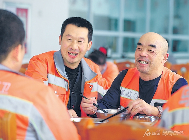 4月5日13時(shí)許,王秋云(右)和工友在食堂用餐。