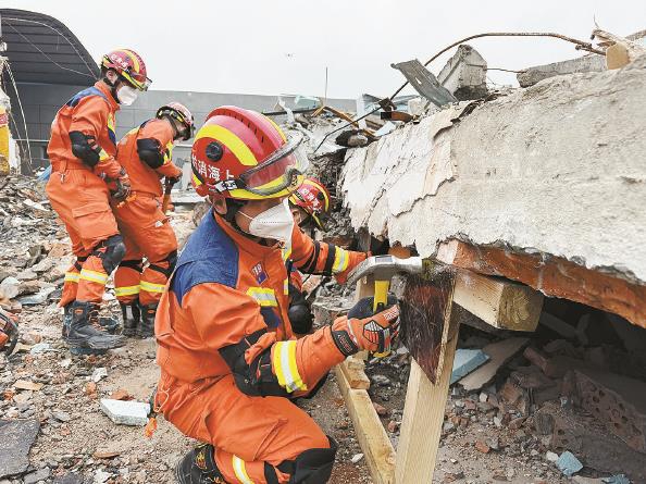 演練中,消防人員在震后廢墟上實施破拆救援 記者 曹博文 攝