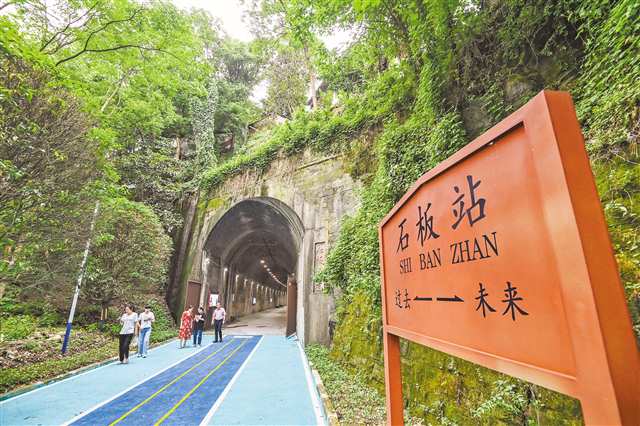 該文化公園由原襄渝鐵路石板隧道廢舊遺址打造而成,包括童趣互動(dòng)、文化驛站和運(yùn)動(dòng)健身3個(gè)主題區(qū)域。隧道內(nèi)有鐵路主題浮雕、復(fù)古式候車站臺(tái)、綠郵箱等舊時(shí)光特色文化打卡點(diǎn),一路向前,有沙池、秋千等兒童游樂(lè)設(shè)施。公園另一端,是五人制足球場(chǎng)、乒乓球場(chǎng)、羽毛球場(chǎng)等。