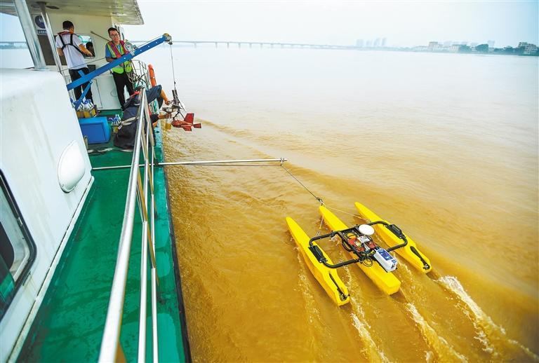 6月19日,江西省樟樹市水文水資源監(jiān)測(cè)大隊(duì)隊(duì)員利用走航式ADCP進(jìn)行流量測(cè)驗(yàn),為及時(shí)發(fā)布洪水預(yù)警提供科學(xué)依據(jù)。周亮 攝(中經(jīng)視覺)