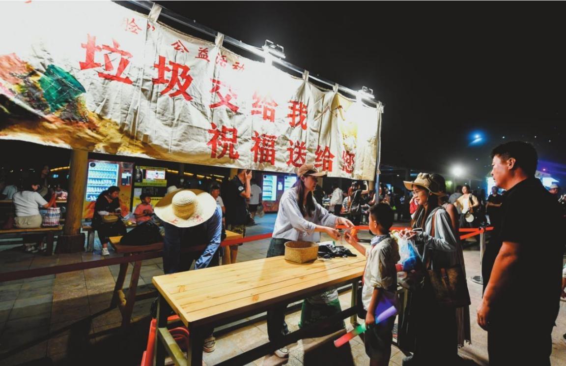 7月20日晚,在敦煌鳴沙山月牙泉景區(qū)的沙漠萬人星空演唱會(huì)現(xiàn)場,游客拎著垃圾向景區(qū)工作人員兌換小禮品。今年暑期,隨著沙漠萬人星空演唱會(huì)火爆出圈,甘肅省敦煌市鳴沙山月牙泉景區(qū)日均接待游客達(dá)2萬人次。景區(qū)推出的“沙山洗臉”公益活動(dòng),通過撿垃圾兌換小禮品等方式,引導(dǎo)游客在享受沙漠萬人星空演唱會(huì)浪漫的同時(shí),共同守護(hù)鳴沙山的生態(tài)環(huán)境。