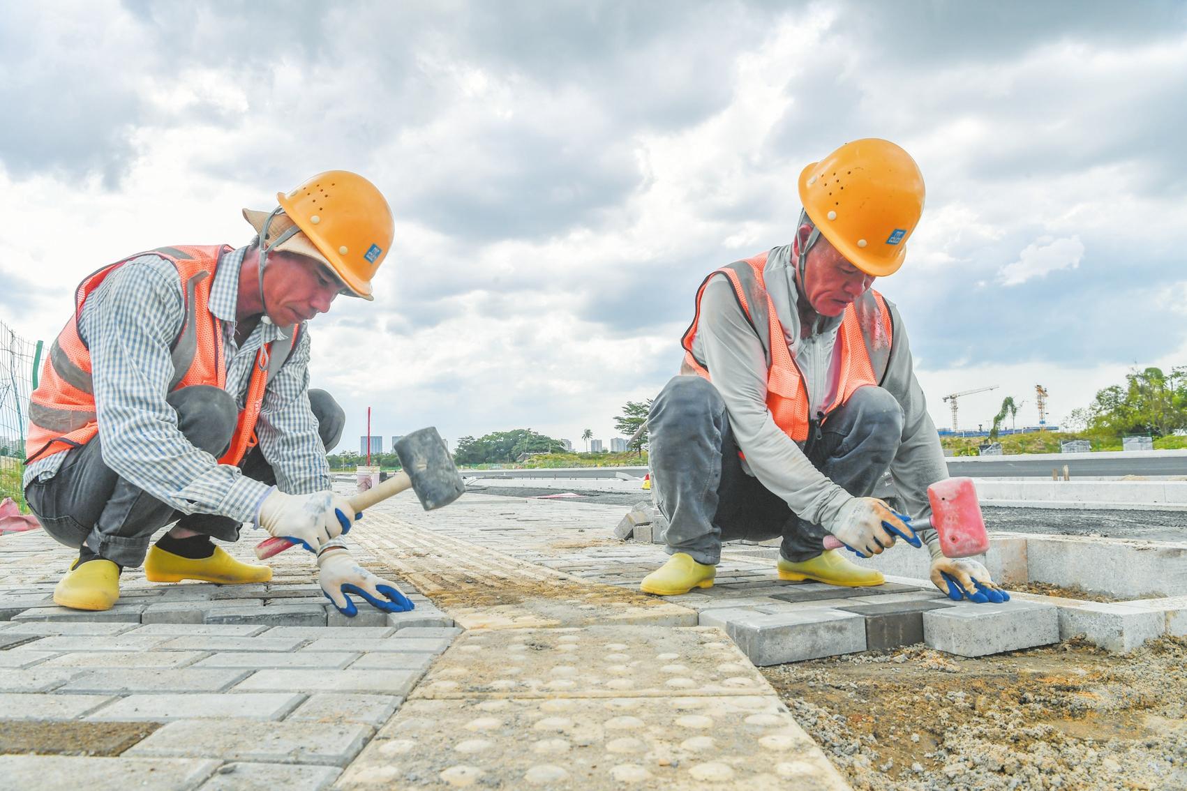 近日,在江東新區(qū)府越路項(xiàng)目西段,施工人員正在鋪設(shè)地磚。記者 孫士杰 攝