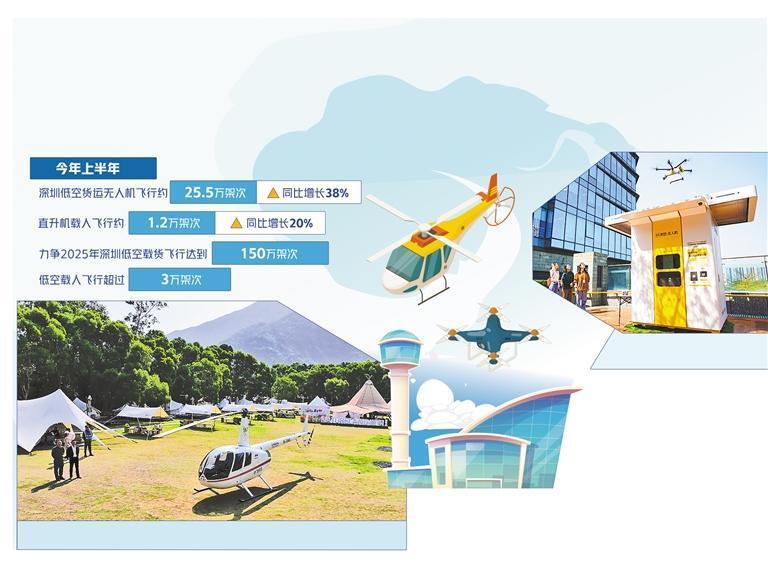 當(dāng)前,深圳低空應(yīng)用場(chǎng)景已覆蓋空中通勤、低空觀光、物流配送、城市治理、應(yīng)急救援等各個(gè)領(lǐng)域,僅在物流配送方面,便涉及快遞配送、餐飲配送、醫(yī)療運(yùn)輸、生鮮冷鏈等。今年上半年,深圳低空載貨無(wú)人機(jī)飛行量、新增貨運(yùn)航線、載人飛行量、運(yùn)送人數(shù)規(guī)模均居全國(guó)前列。其中,低空貨運(yùn)無(wú)人機(jī)飛行約25.5萬(wàn)架次,同比增長(zhǎng)38%;直升機(jī)載人飛行約1.2萬(wàn)架次,同比增長(zhǎng)20%。目前,深圳正進(jìn)一步拓展應(yīng)用服務(wù),力爭(zhēng)2025年低空載貨飛行達(dá)到150萬(wàn)架次,低空載人飛行超過(guò)3萬(wàn)架次。