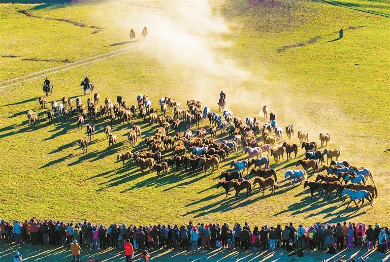 9月25日,內蒙古自治區(qū)赤峰市克什克騰旗烏蘭布統(tǒng)景區(qū),壯觀的萬馬奔騰表演,吸引了大批游客和攝影愛好者。張連華攝(中經(jīng)視覺)