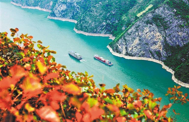 10月10日,船舶行駛在紅葉掩映下的長江三峽重慶市巫山縣水域。王忠虎攝(中經(jīng)視覺)