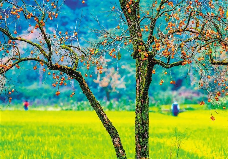 10月9日,浙江省紹興市諸暨市楓橋鎮(zhèn)王村,紅紅的柿子掛滿枝頭,成為秋日里一道亮麗風景。潘偉峰攝(中經(jīng)視覺)