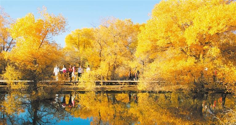 10月12日,游客在甘肅省酒泉市金塔沙漠胡楊林景區(qū)欣賞金色胡楊美景。許崗攝(中經(jīng)視覺)