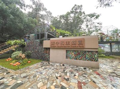 在新桐木和茄子樹旁,園區(qū)利用“廢品”打造綠色低碳創(chuàng)意場(chǎng)景,使用廢棄塑料瓶搭建“勺嘴鷸”藝術(shù)墻、廢棄地磚鋪砌科普展館建筑外表面、園藝工具剪刀設(shè)計(jì)成“魚躍龍門”等,為整個(gè)碳中和主題園增添了不少意趣。可再生能源方面,園內(nèi)科普展館等建筑物屋頂裝有分布式光伏發(fā)電板,借助智能化能源轉(zhuǎn)換系統(tǒng),以清潔能源為園內(nèi)照明系統(tǒng)等進(jìn)行供電。資源循環(huán)利用方面,中水回用展示水池采用目前國(guó)內(nèi)領(lǐng)先的水處理技術(shù),將園區(qū)廢水和收集的雨水處理達(dá)標(biāo)后,用于園區(qū)植物灌溉,減少水資源使用;園林垃圾資源化處理為塑料替代材料,制成鍋碗瓢盆、餐具、掛鐘、砧板等生活用品;以園林綠化廢棄物資源化處理產(chǎn)物——有機(jī)基質(zhì)作為原材料,結(jié)合廣府文化,設(shè)計(jì)開發(fā)“黑金”手環(huán)等文創(chuàng)產(chǎn)品。