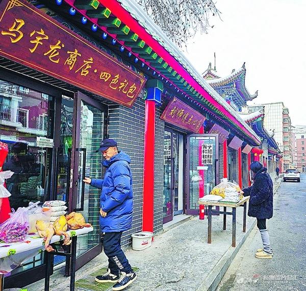 烏魯木齊市永和巷按照中式仿古建筑風(fēng)格改造,既保留了老街的歷史韻味,又賦予其現(xiàn)代審美。圖為1月6日,居民在永和巷選購商品。