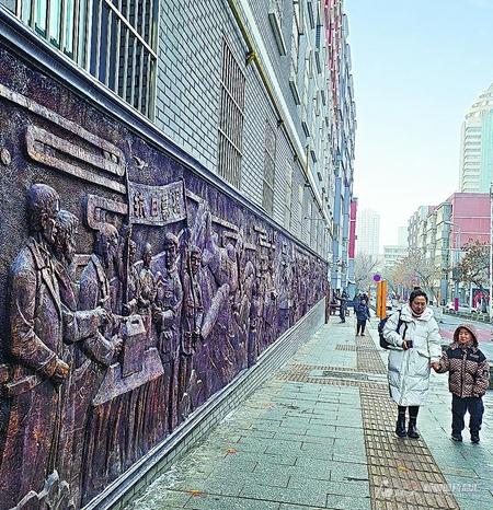 新增的一組浮雕墻、雕塑等生動展現(xiàn)烏魯木齊市明德路的歷史。圖為1月6日,一位居民帶著孩子從浮雕墻前經(jīng)過。