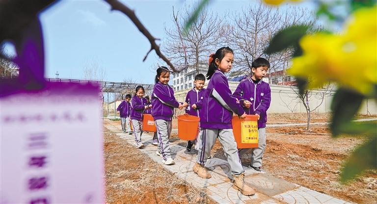 3月11日,山東省青州市南湖學(xué)校勞動實踐基地,小學(xué)生提水澆灌新栽植的樹木。王繼林 攝(中經(jīng)視覺)