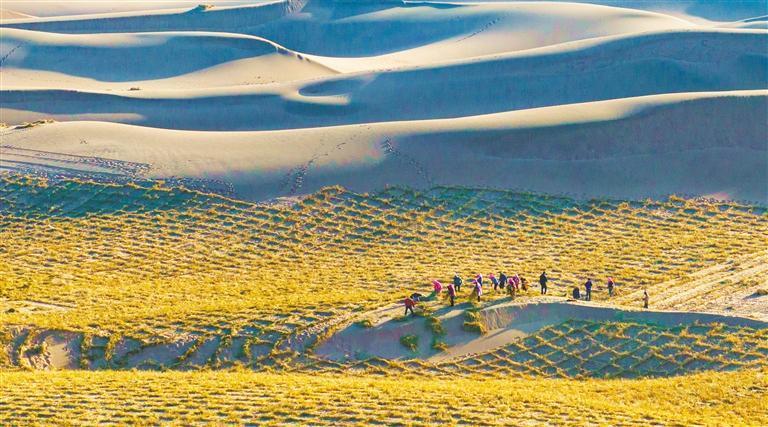 今年3月12日是我國第47個植樹節(jié)。3月8日,甘肅省張掖市臨澤縣北部沙漠治沙區(qū),治沙員在埋設(shè)草方格沙障。楊永偉 攝(中經(jīng)視覺)