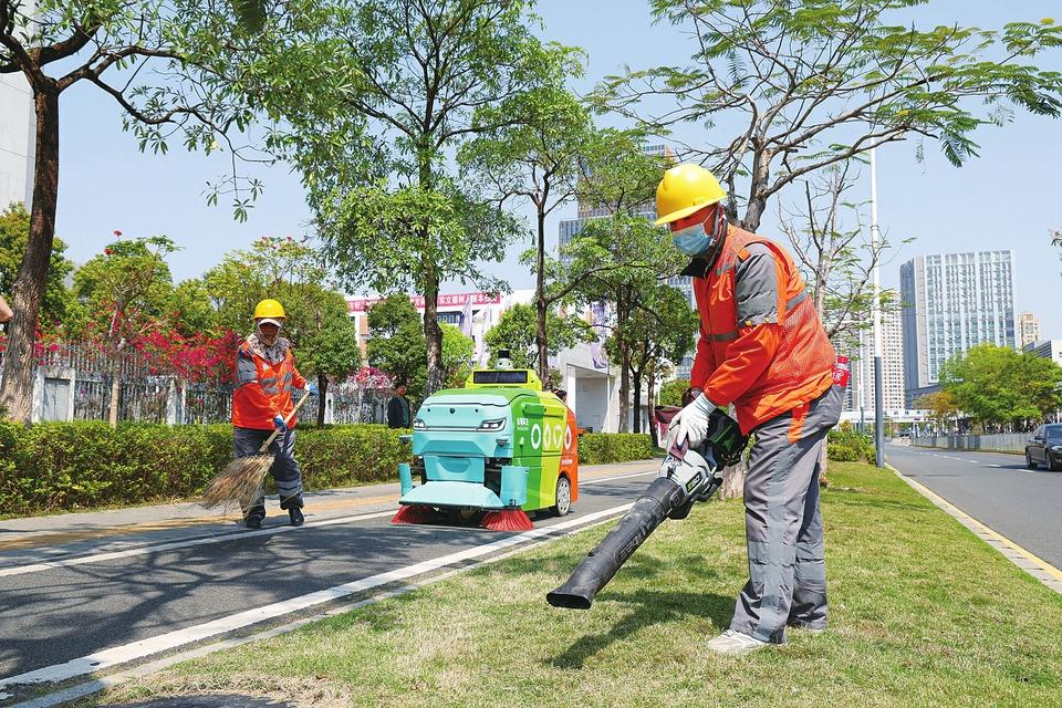3月19日,在深圳市坪山區(qū)石井街道,環(huán)衛(wèi)機器人與環(huán)衛(wèi)工人進(jìn)行協(xié)同作業(yè)。在深圳市坪山區(qū)石井和坑梓兩個街道,道路上不時能看到彩色的環(huán)衛(wèi)機器人出沒。它們能夠自主識別垃圾、自動返回基站倒垃圾并加水,與環(huán)衛(wèi)工協(xié)同配合完成復(fù)雜道路清掃工作。(新華社記者 毛思倩攝)