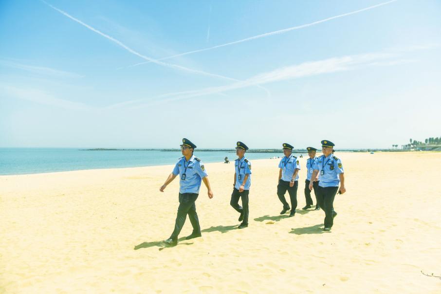 消博會期間,???/span>市綜合行政執(zhí)法局海洋和漁業(yè)行政執(zhí)法支隊執(zhí)法人員巡查會展中心周邊沙灘。