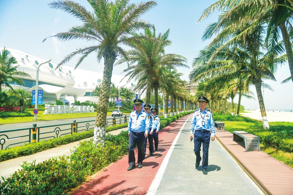 消博會期間,???/span>市綜合行政執(zhí)法局生態(tài)環(huán)境保護行政執(zhí)法支隊執(zhí)法人員在海色路巡查。