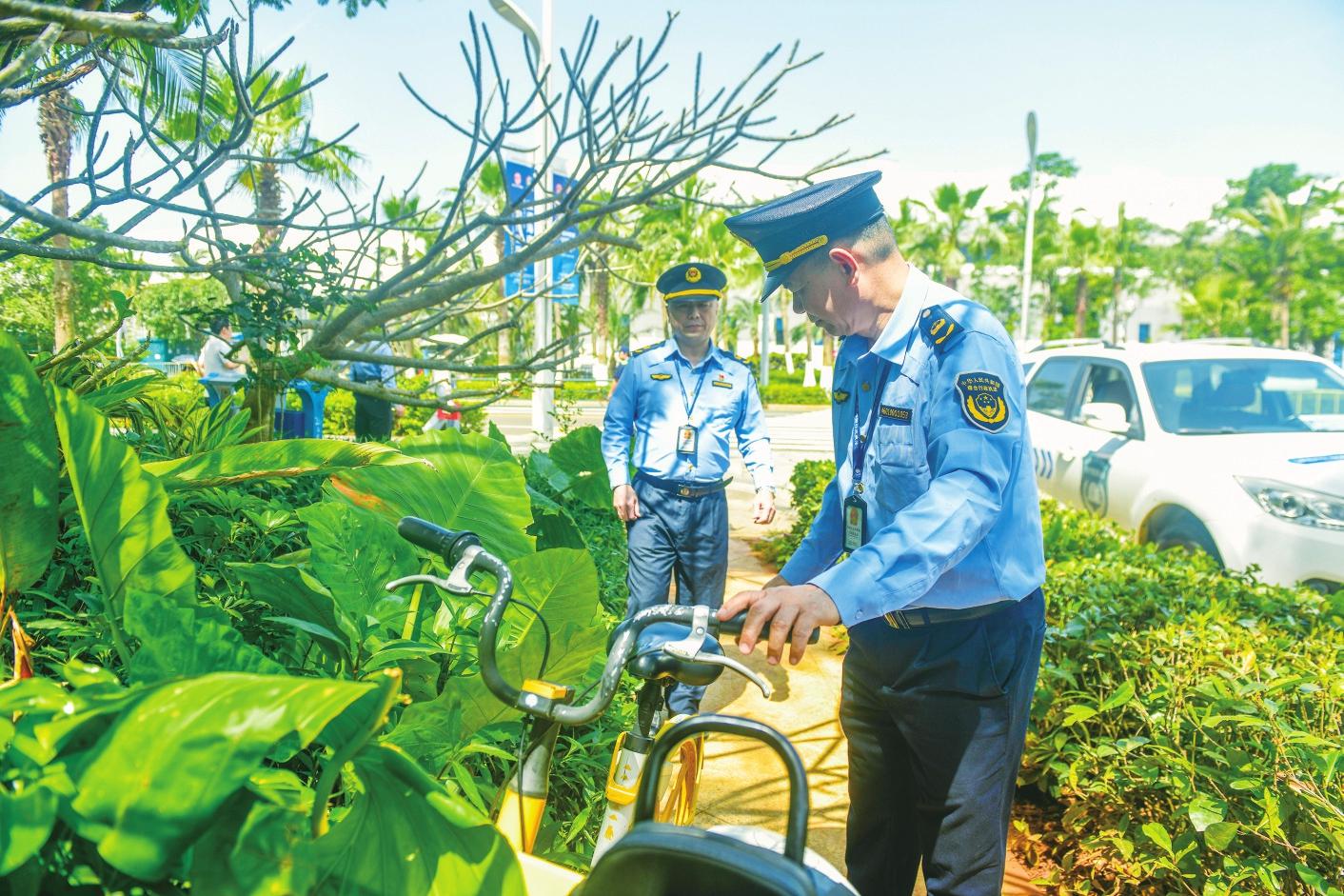 生態(tài)環(huán)境保護行政執(zhí)法支隊主要負責巡控海色路區(qū)域,維持通行秩序,為市民指引路線,清理流動攤販,規(guī)范共享單車和電動自行車的停放秩序。(鄧宇)