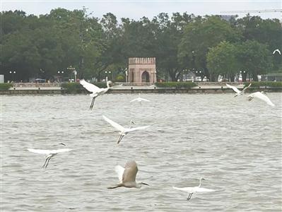 近年來(lái),廣州人居環(huán)境持續(xù)優(yōu)化提升。6月15日中午,白鵝潭江面聚集了一大群白鷺,吸引市民游客駐足拍攝。記者 蘇俊杰 攝