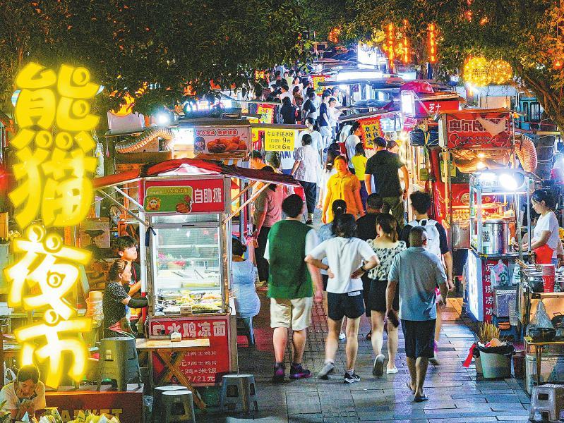 夜色中,熊貓夜市的100余個(gè)攤位陸續(xù)支起,食物的香味四下彌漫,居民游客陸續(xù)到來(lái),或穿梭游走,或駐足光顧。到第二天一早,這段道路又變得寬敞干凈,路面幾乎看不出昨夜煙火升騰的痕跡。