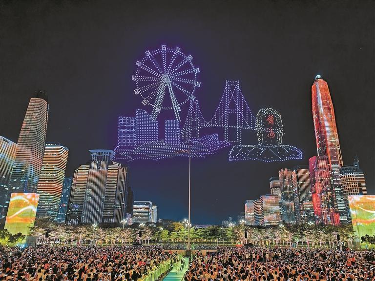 當(dāng)無人機(jī)陣列掠過夜空,地面建筑群也將隨之脈動。流光從云端灑向樓宇,色彩如呼吸般明滅變幻,天地連成一體。霓虹勾勒出特區(qū)發(fā)展長卷,光影流轉(zhuǎn)中浮現(xiàn)特區(qū)精神的時(shí)代符號——這是一座城市向自己的生日深情致敬。