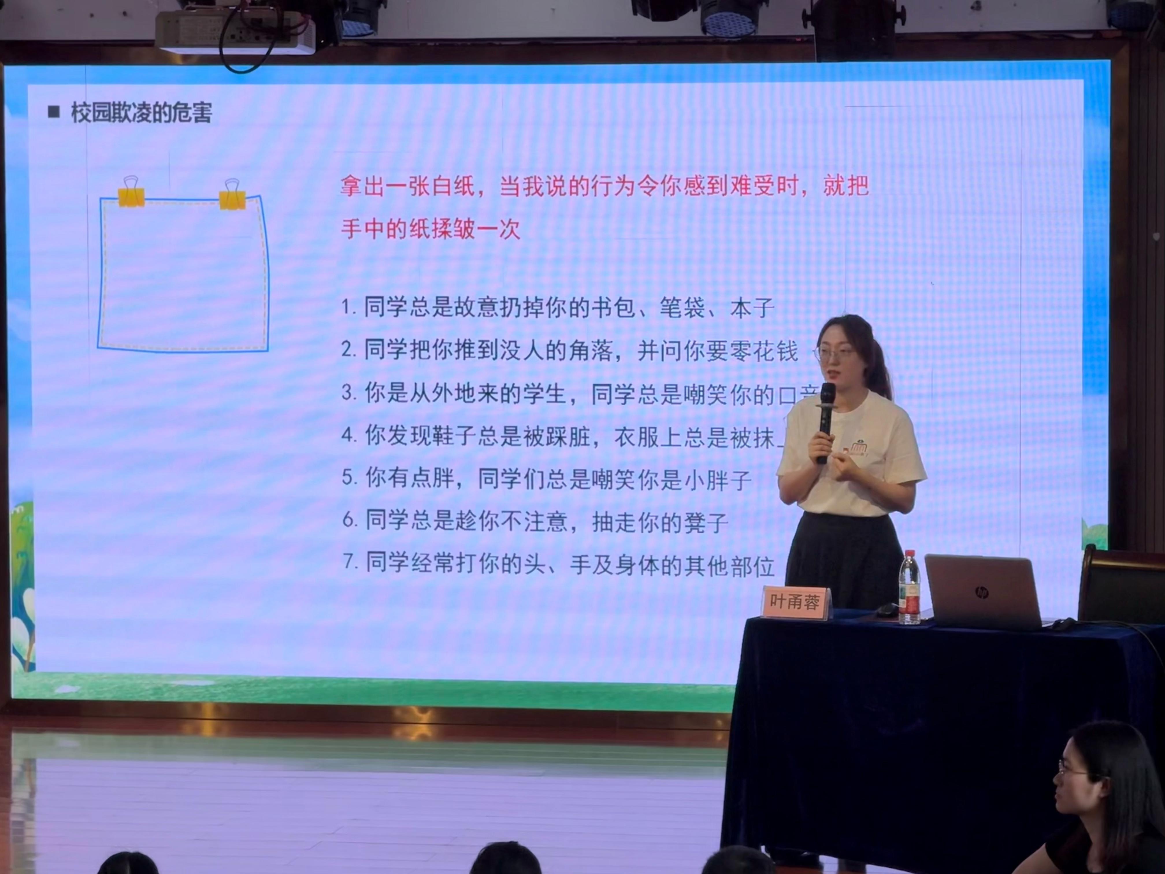 9月25日下午,鐘公廟中學(xué)420名師生也迎來了“平安第一課”。課程內(nèi)容緊扣初中生身心特點(diǎn),講師董黎娜重點(diǎn)剖析校園欺凌的表現(xiàn)形式與應(yīng)對策略,同時(shí)結(jié)合季節(jié)特點(diǎn)強(qiáng)化防溺水教育,并針對當(dāng)前高發(fā)的電信網(wǎng)絡(luò)詐騙進(jìn)行預(yù)警提示,幫助學(xué)生筑牢思想防線。9月26日,志愿團(tuán)又走進(jìn)天童小學(xué),為200余名小學(xué)生開展專題普法教育,講師葉甬蓉用通俗易懂的語言講解“什么是欺凌”“如何說不”,在孩子們心中播下法治與尊重的種子。