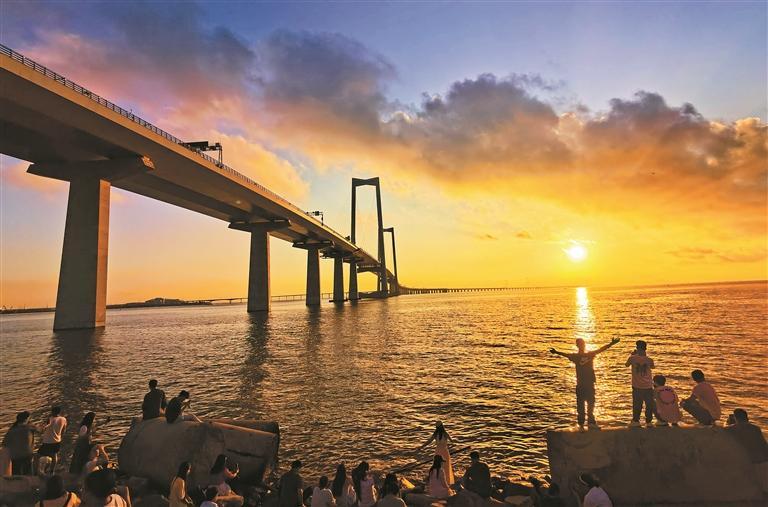 清晨時分,深中通道在朝霞的映襯下宛如一條金色巨龍。市民們拿出手機、相機,記錄下這令人震撼的瞬間。